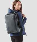 Recycled 600D polyester. PVC and phthalate free. Reinforced grab handles, top and side. Padded adjustable shoulder straps. Padded air mesh back panel. Main zip compartment. Internal organiser section. Secure front zip pocket. Padded laptop compartment compatible up to 17". Wheeled luggage compatible. Capacity 21 litres.